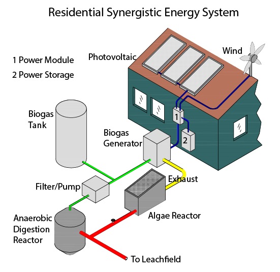 A synergistic system makes use of multiple sources of energy which are available on site and reduce the fluctuation and storage capacity. A typical house designed by Green New World has three mechanisms to generate electricity which are can be met with a combination of photovoltaic, wind and biogas. Solar and wind cover the average electric energy needs and peak demand is supplied by a biogas generator. Residential hot water can be provided for by geothermal, solar, biogas and wood or biobricks/ biopellets made from sludge. Much of the needs for space heating and cooling are provided for by design and materials of the building which reduces or eliminates further need for climate adjustment. Additional heating and cooling systems can be integrated as required such as heating using an efficient fireplace, geothermal heat exchangers that are supplemented with biogas and solar. Wind capture by a wind scoup and evaporation chambers are efficient and energy independent methods to cool a residential structure in combination with the integrated design features of the building.
